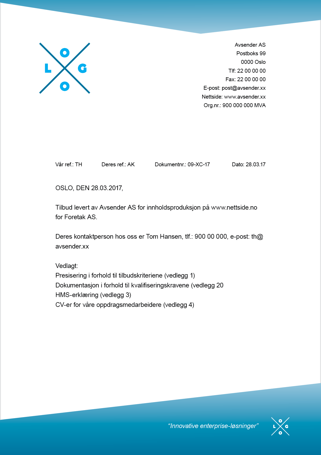 Pass likevel på at forsiden din ser ut som et dokument, og ikke en brosjyre eller et magasin. Det kommer an på hva slags tilbud du sender, men det bør ikke se for uvant ut for mottakeren. Tenk derfor nøye igjennom eventuell bildebruk og grafiske elementer.