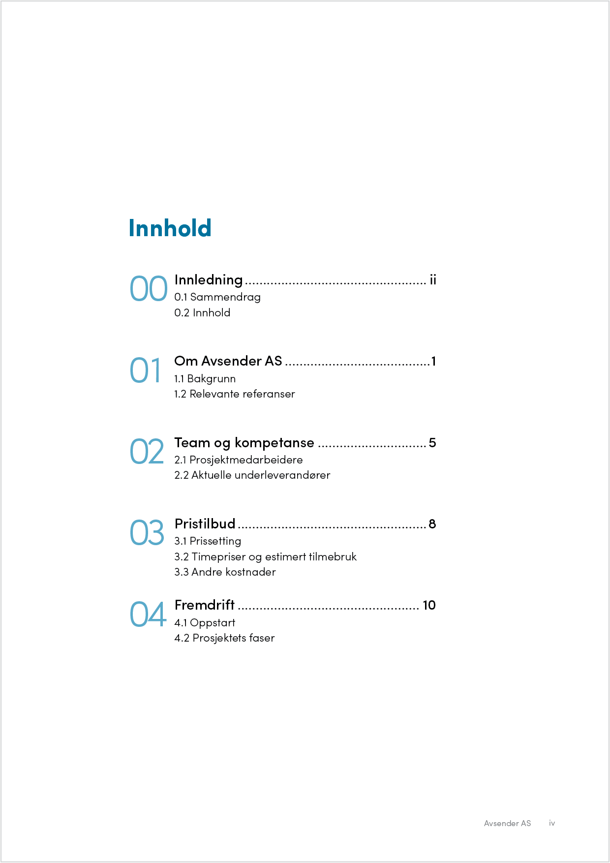 En god innholdsfortegnelse gir leseren en rask oversikt over dokumentet, og gjør det lett å finne tilbake til spesifikke deler av tilbudet senere.